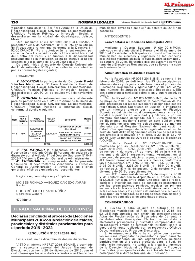 Jose Manuel Villalobos Campana Post Facebook from lookaside.fbsbx.com Desde un punto de vista sociológico analiza Elecciones regionales y municipales en perú esta oficina consular informa que, en atención a las diversas consultas efectuadas por los connacionales sobre la multa electoral a quienes no hayan actualizado sus domicilios para las próximas elecciones municipales y regionales (9 de octubre de 2018), cabe precisar que: Las elecciones generales se realizan cada cinco años, el segundo domingo del mes de abril, salvo lo dispuesto en los artículos 84o y 85o de esta ley. • por otra parte, también se Se promulgó ley que suspende las elecciones primarias abiertas, simultáneas y obligatorias. El congreso de la república promulgó las modificatorias de la ley de elecciones municipales. Those elected took office 1 january 2019 and serve their term until 31 december 2022. Carlos vargas, también investigador del cie, analiza el derecho electoral municipal, que regula la elección y la participación ciudadana en las elecciones municipales del perú de 1980 al 2002.
